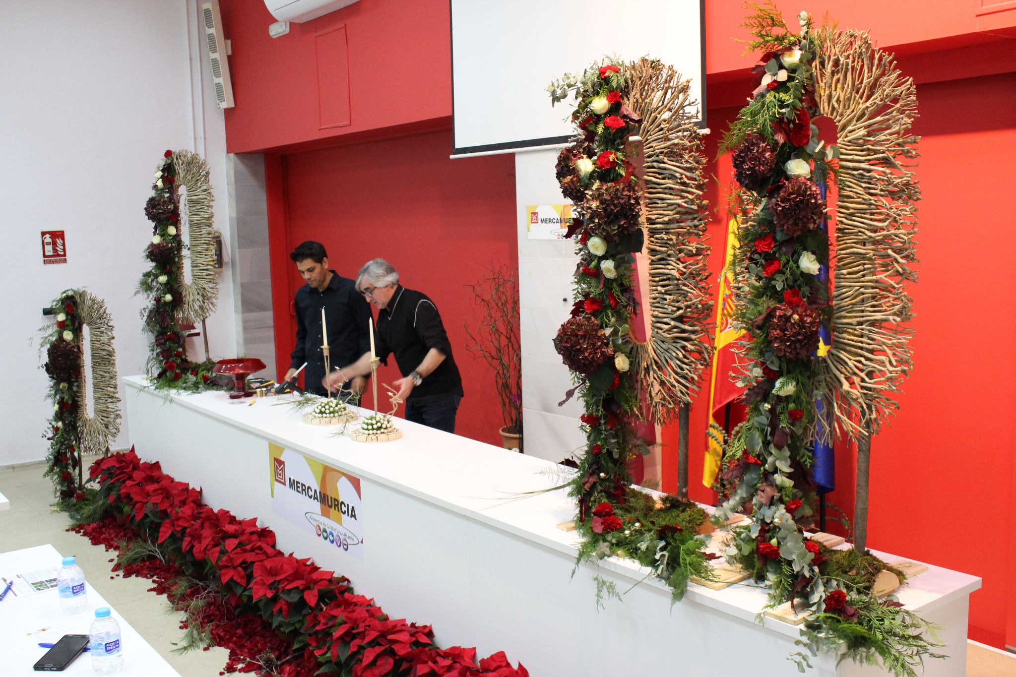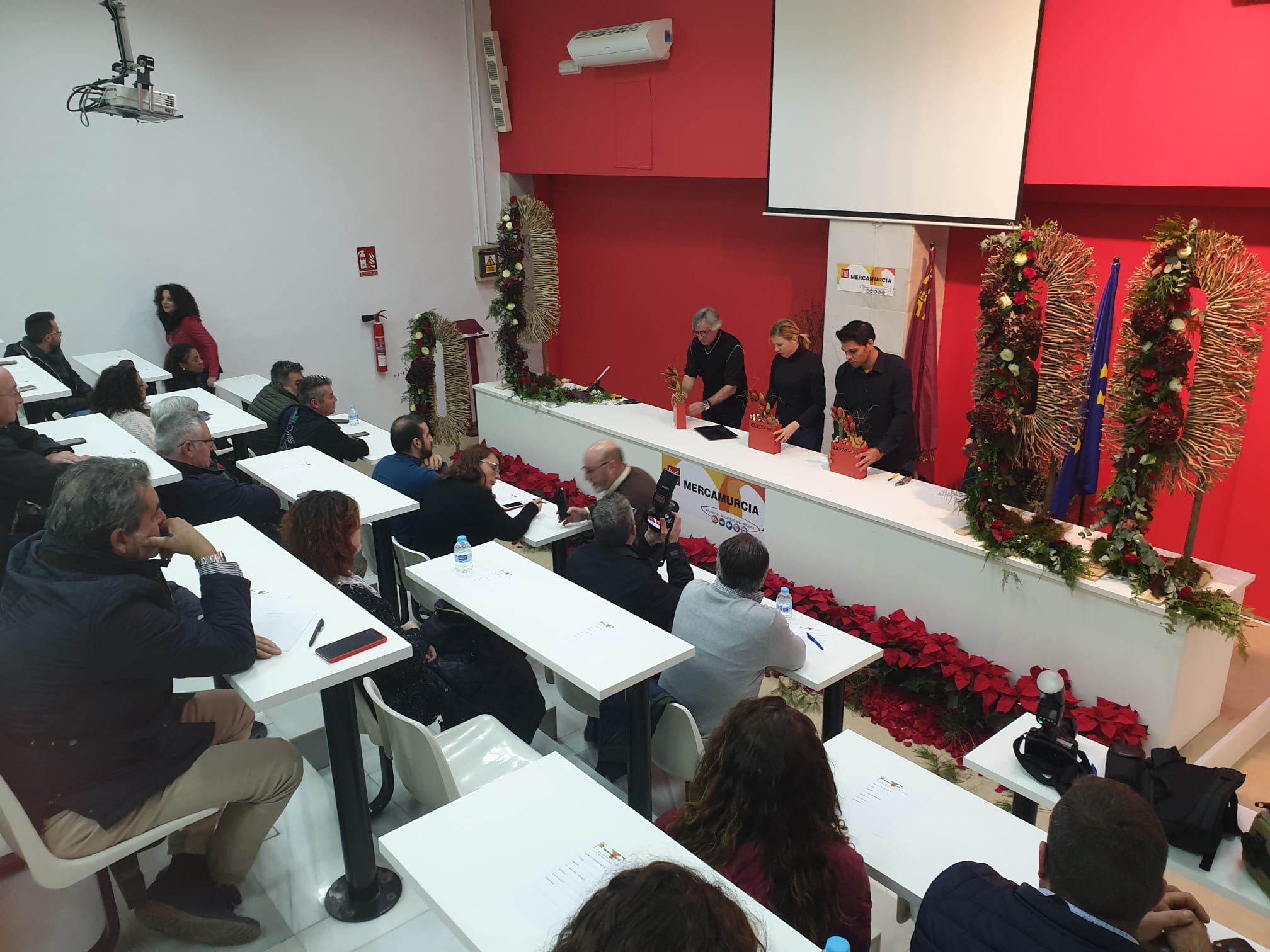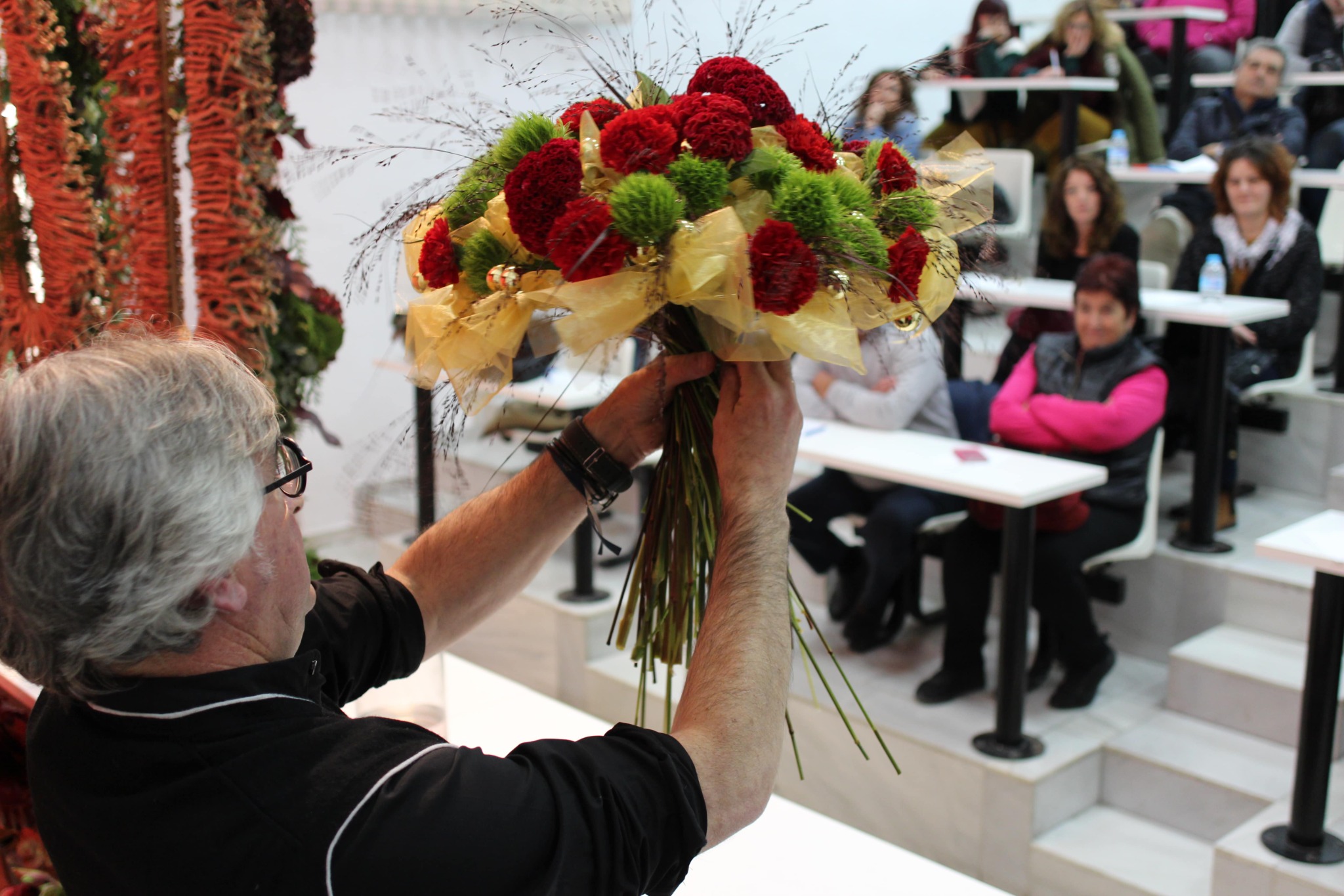 Más de 30 trabajos especialmente pensados para ofrecerlos a los clientes durante estas fiestas navideñas, fueron mostrados por Juan a la atenta mirada de los asistentes, profesionales de la floristería procedentes tanto de Murcia como de las provincias colindantes de Alicante, Almería, Albacete o Valencia y que llenaron la sala y disfrutaron de una tarde de encuentro con el sector.